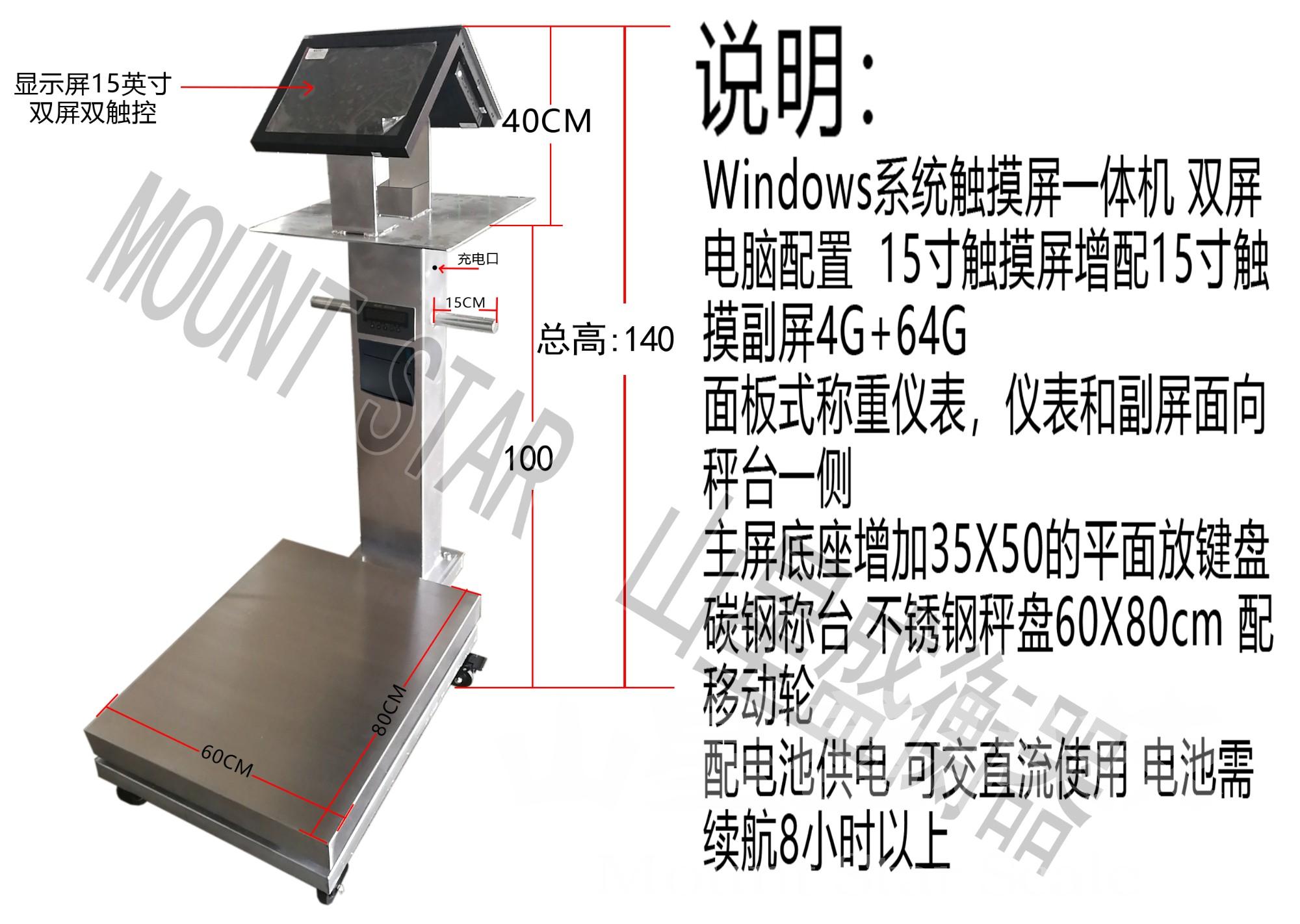 多功能一體電子秤是在電子秤的基礎(chǔ)上加裝多種選配件組裝成,由15寸雙觸膜顯示器+打印機(jī)+充存電+攝像頭+掃碼裝置等